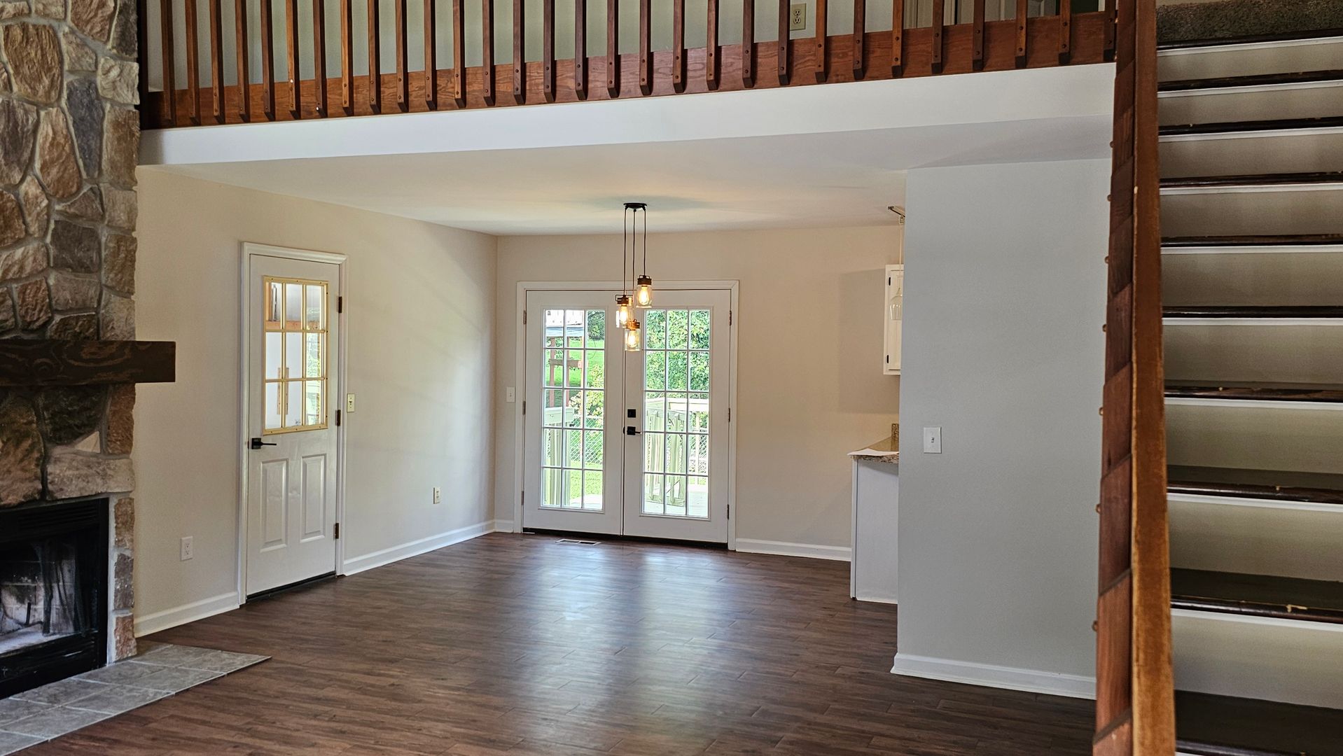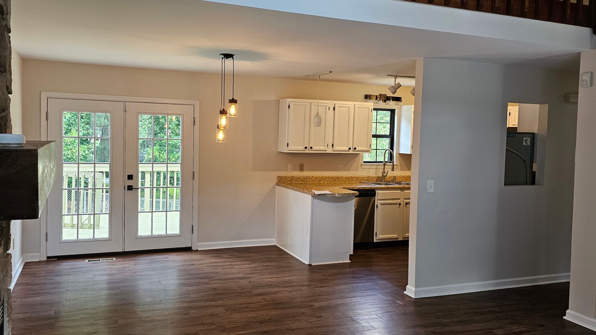 This house has a large living room, kitchen with dining area, french doors to the back patio, lots of windows and lots of closets.